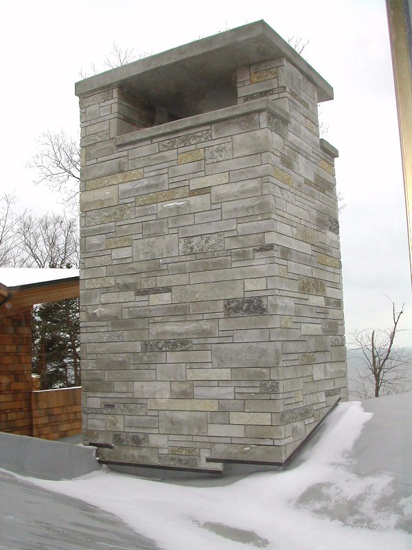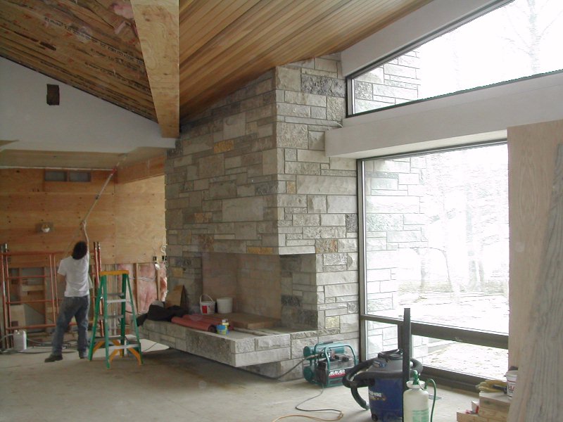 Limestone fireplaces. That's not a reflection in the glass, there's another fireplace on the exterior.