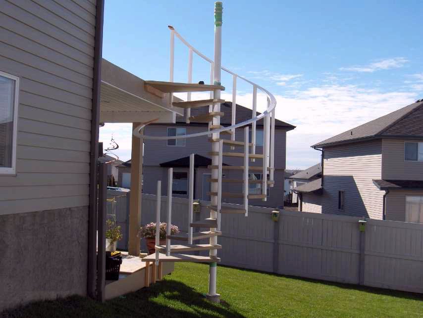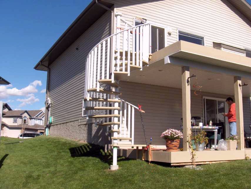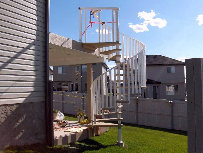 My stair case is 72" in dia, 14' and rotates 420 deg. It is attached to my deck