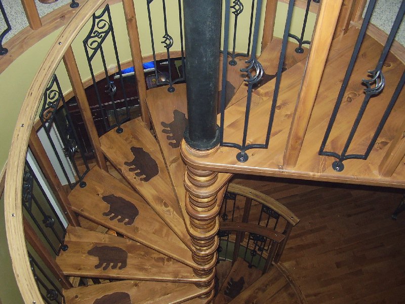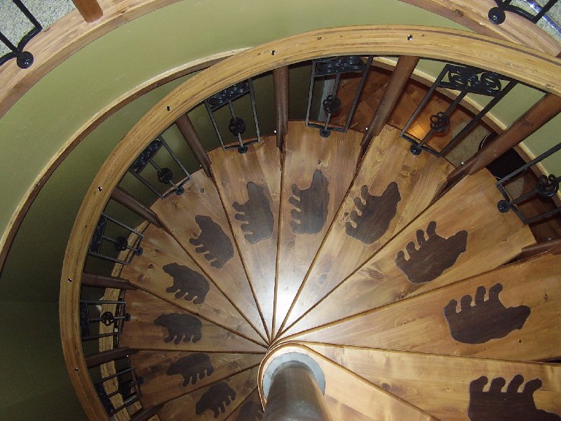 You've probably already noticed the bear inlays on each tread done with a darker wood. Also of interest are the steel balusters placed between the wood balusters.