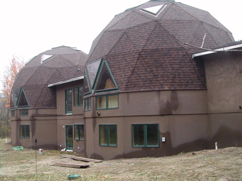 I was contracted to assemble a pair of domes and built a pair of spiral stairs for their interiors. The lower floor walls without windows were eventually backfilled close to the main floor heights.