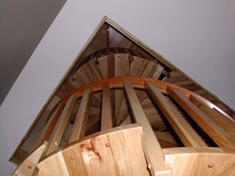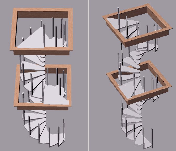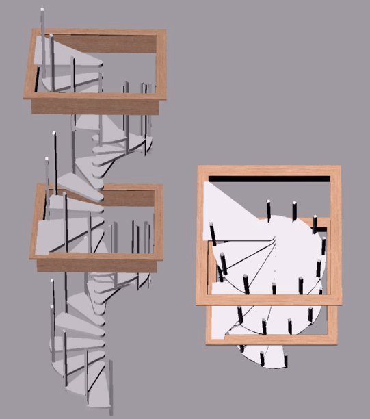 Using my CAD program I was able to construct the upper spiral so it turned to where the landing would fall on the floor hole edge. The landings shown here are what was needed to position both the upper and lower staircases.