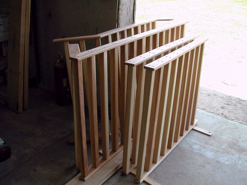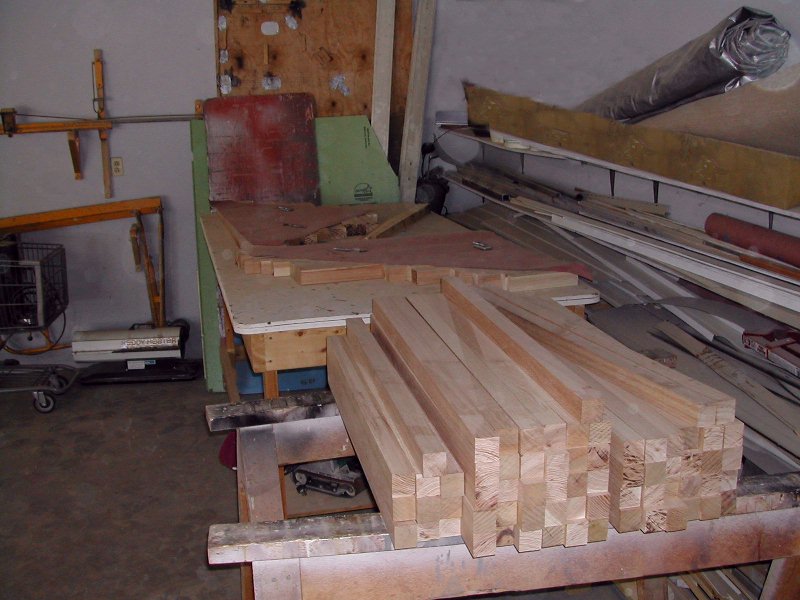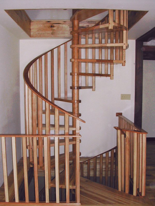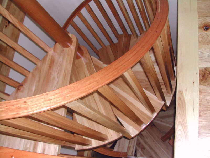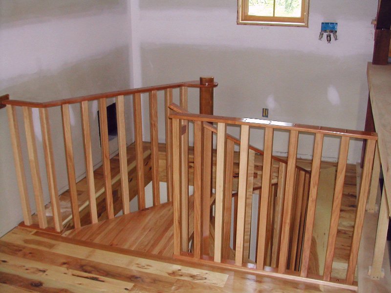 The treads and balusters were made of knotty hickory to match the homes floor material. The spacers pictured here were veneered with cherry, a wood that looked pretty good with the hickory.
