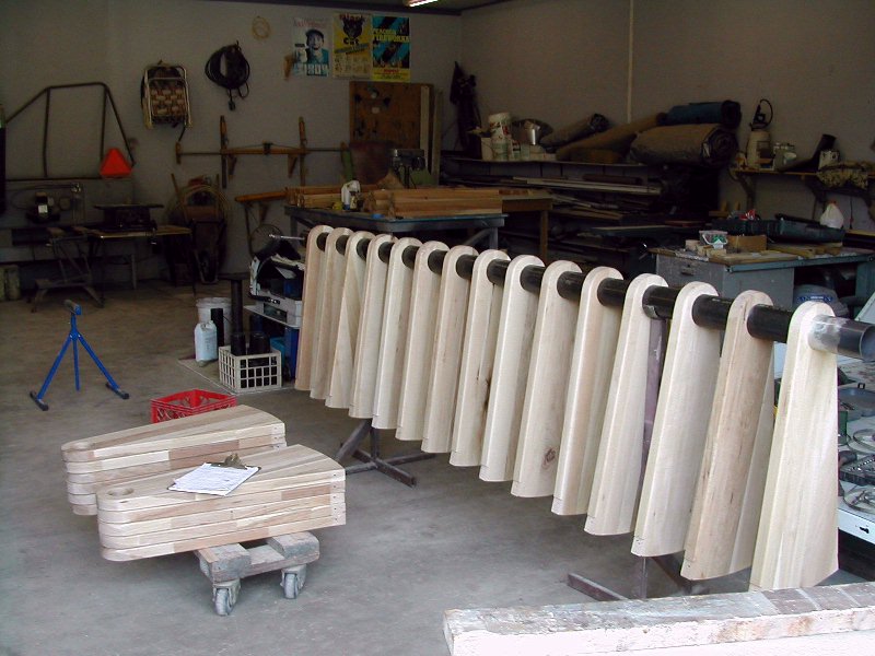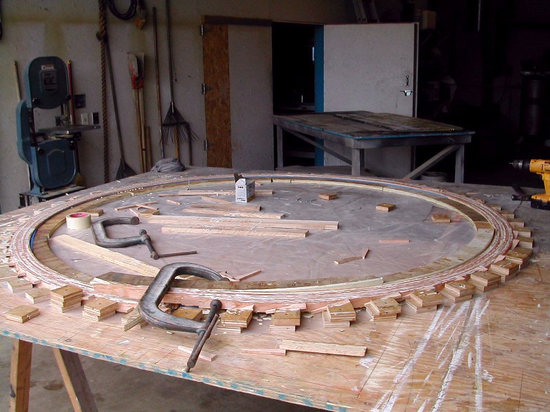 I also used cherry for the handrailings. I didn't have any hickory that wasn't full of knots which would have been very hard to make a handrail from. In this picture you can see that the railing needed to go a little more than once around the form. Both the wedging blocks and the inner edge of the form had to be made higher. I had plastic sheet between the railings so they wouldn't be glued together.