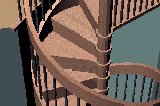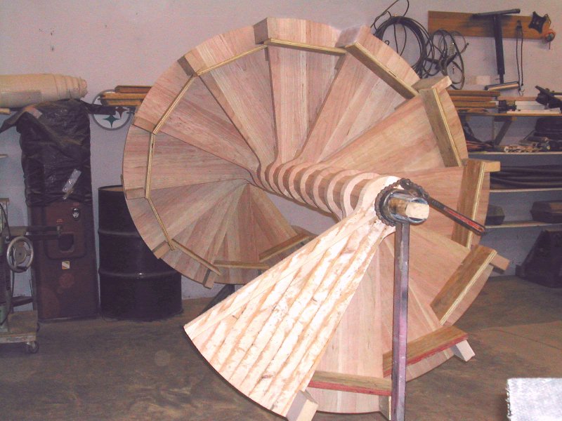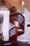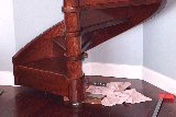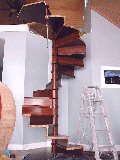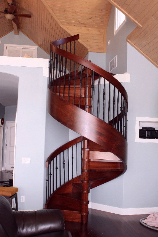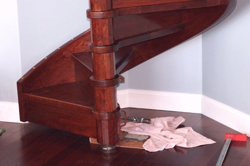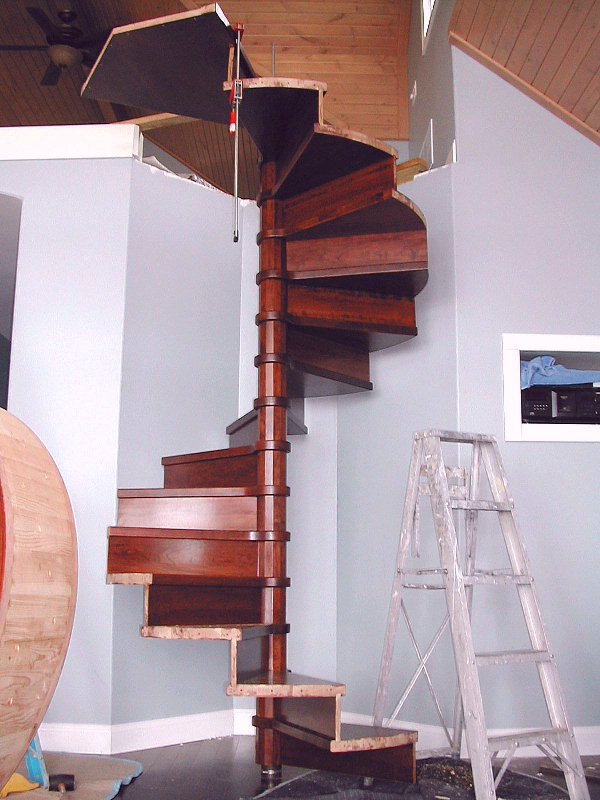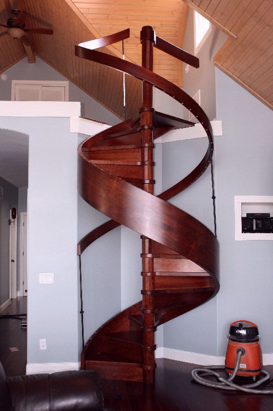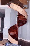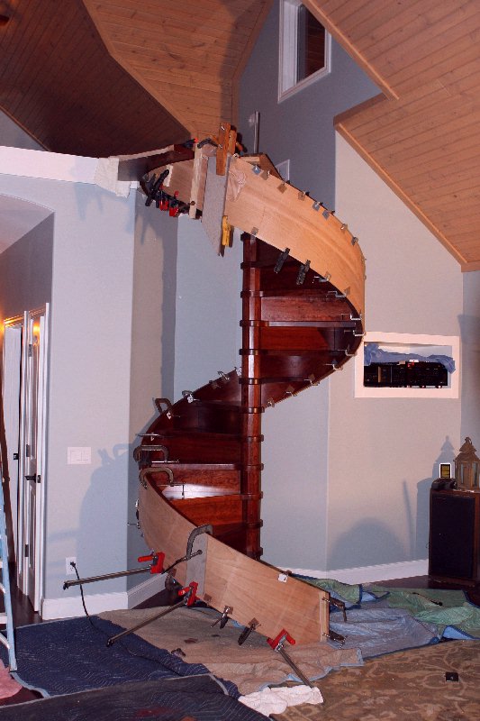 The amazing part here is that all the parts went into place without a lot of fighting with them. It's a little hard to tell here, but we set the stair up on temporary blocks which allowed us to revolve the whole spiral during assembly. Notice I said we about now. I was just contracted to build and assemble the stair, not do the staining or install the steel balusters. After delivering the parts to the Woodward families I wasn't called back to help with the assembly until they'd completed the staining and polyurethane coatings.