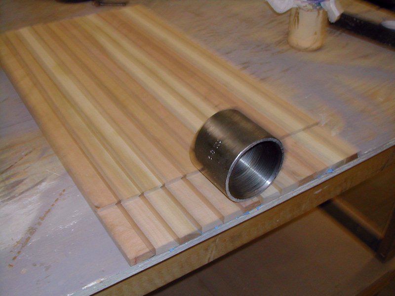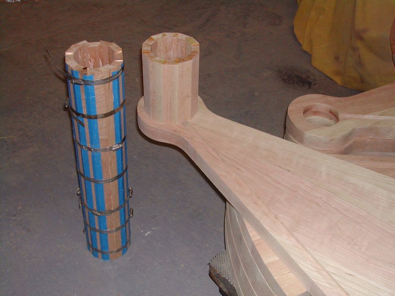 I have used wood tube for spacers before as they have a nice look to them but they do require a lot of extra work. Note the blue tape that keeps the wood strips positioned while the hose clamps are positioned.