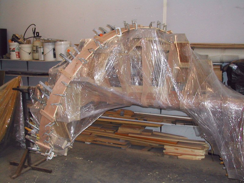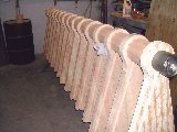 The next jobs are going to be real messy so the stair has been wrapped in plastic sheeting. You can see that I've glued and clamped several of the handrail laminations to the treads and fastened them in position until the glue dries.