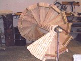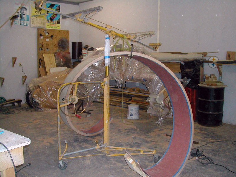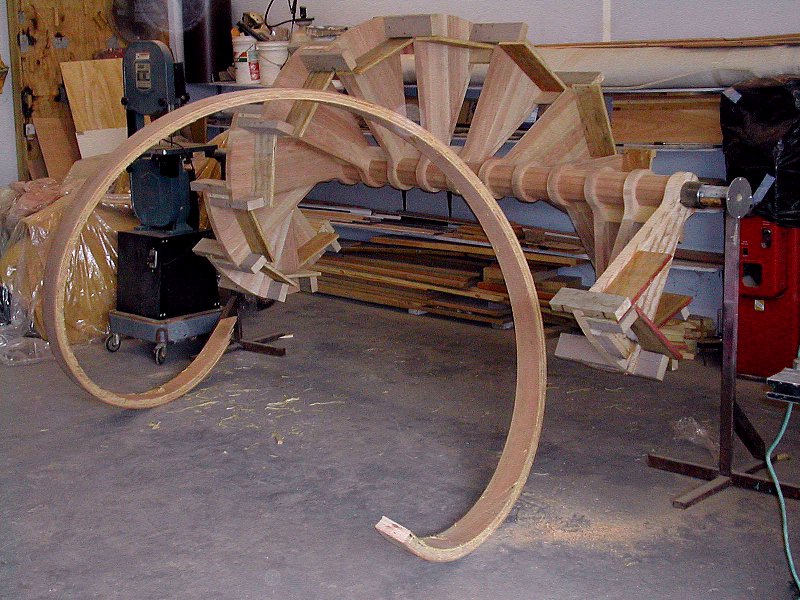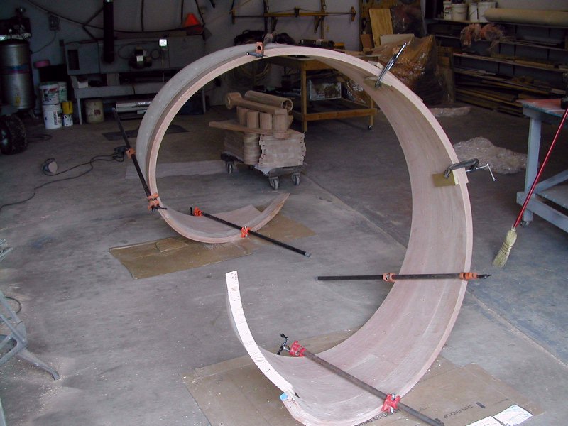 I built a little something to help feed the wood into position so they could be glued then the stair revolved which rolled the laminations into place. I was able to do just a few feet at a time so I wasn't having a problem with the glue drying before placement.