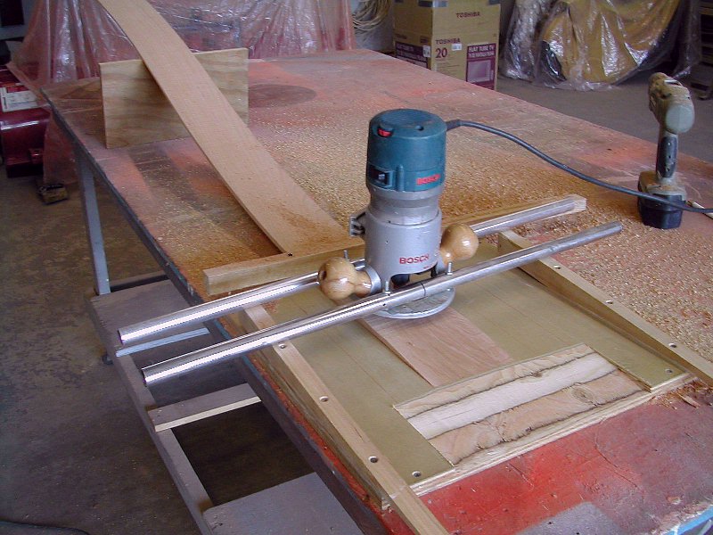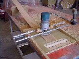 The handrail is close to two inches thick and close to 22 feet long, so I've made a jig that helps in making scarf joints for joining 1/4 by 6" wood into proper length lamination material. Attached to the router are two short pieces of tubing that slide up and down along the side rails.