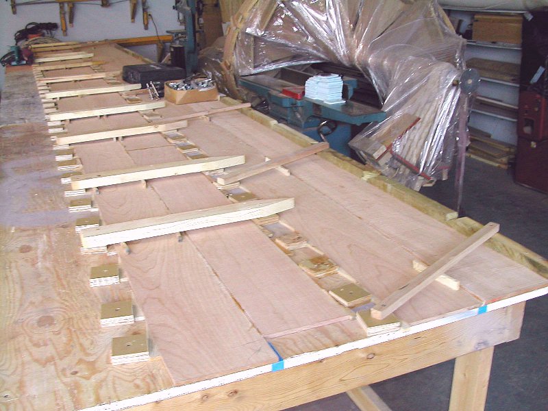 The stringers will also be needing 22 foot long wood, except 15" wide, for at least the inner and outer stringer surfaces, so here I'm joining side to side as well as for length. These are a lot more difficult to make than it would seem, so I've planned on just making them for the surfaces that show rather than filling the core too.