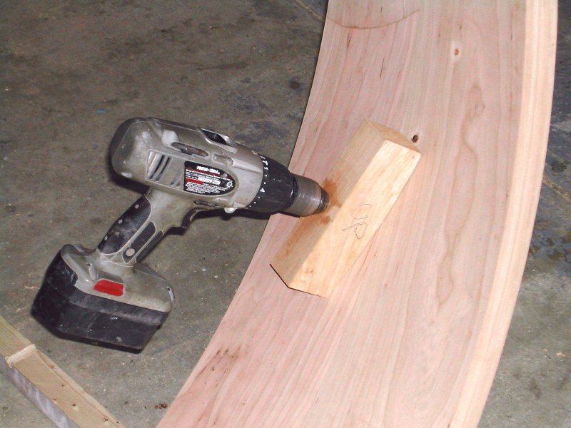 Using a small wood block with a radius matching the stringer, drill transfer the previously made holes from the inside stringer face to the outside. The wood block held the drill perpendicular to the surface. After I knew where the outside holes were located I could counter bore from the outside to allow for bolts and washers that would be used to attach the stringer.